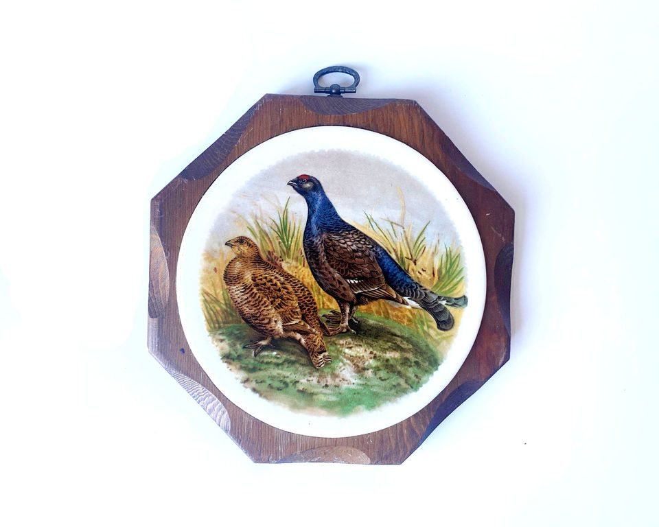 A unique piece of vintage home decor featuring wild fowl, printed on a ceramic tile and mounted on a wooden display panel with metal accents. Great condition with very minor signs of wear (as pictured).